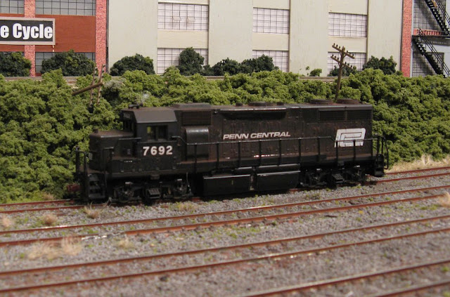 GP38 #7692  This is an Atlas Yellow Box model from the early 1980s that I purchased at a flea market last year, still unopened in the box.   It runs very nicely.  The unit was undecorated so I painted and lettered it as #7692.   The PC had 268 of these EMD units.  According to Jeremy F. Plant in "Penn Central in Color Vol. 2", the New York Central and Pennsylvania Railroads weren't interested in the GP38 when it first came out, but "by 1969 it was the engine of choice" and the PC purchased 150 of what would eventually become a roster of almost 500 including the refined version, the GP38-2.     Plant quotes "Penn Central Power" author Robert Yanosey as noting that "the GP38 symbolizes the Penn Central".    GP38 #7692 heads local freights on the Kings Port Division thanks to its excellent slow speed switching qualities.
