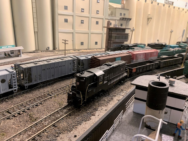 A couple of hours later today's Mayfield Transfer arrives and drops off a string of loaded coal hoppers from the Lehigh Valley connection. The reduced number of freight cars in the yard gave the KP&W Geeps the opportunity to do a quick run around and get behind the cut of cars going to Mayfield, including the Pacemaker and GM&O car.