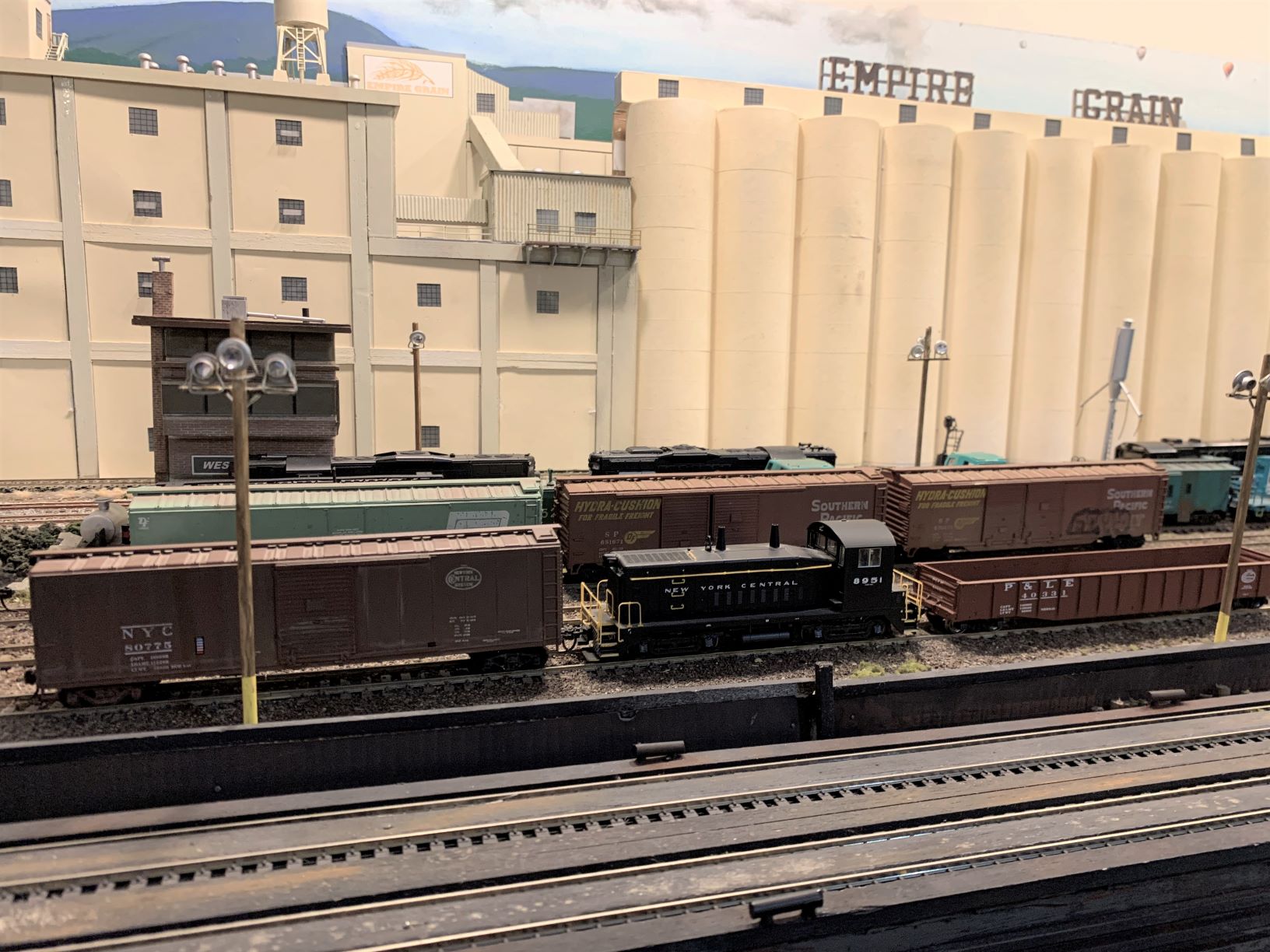 After pulling the NYC car the switcher passes empty P&LE gon #40331 at Sal's Salvage. This is the next pick up. The P&LE gon will be forwarded to Bell Pole in Bloomberg as yet another intra-layout move.